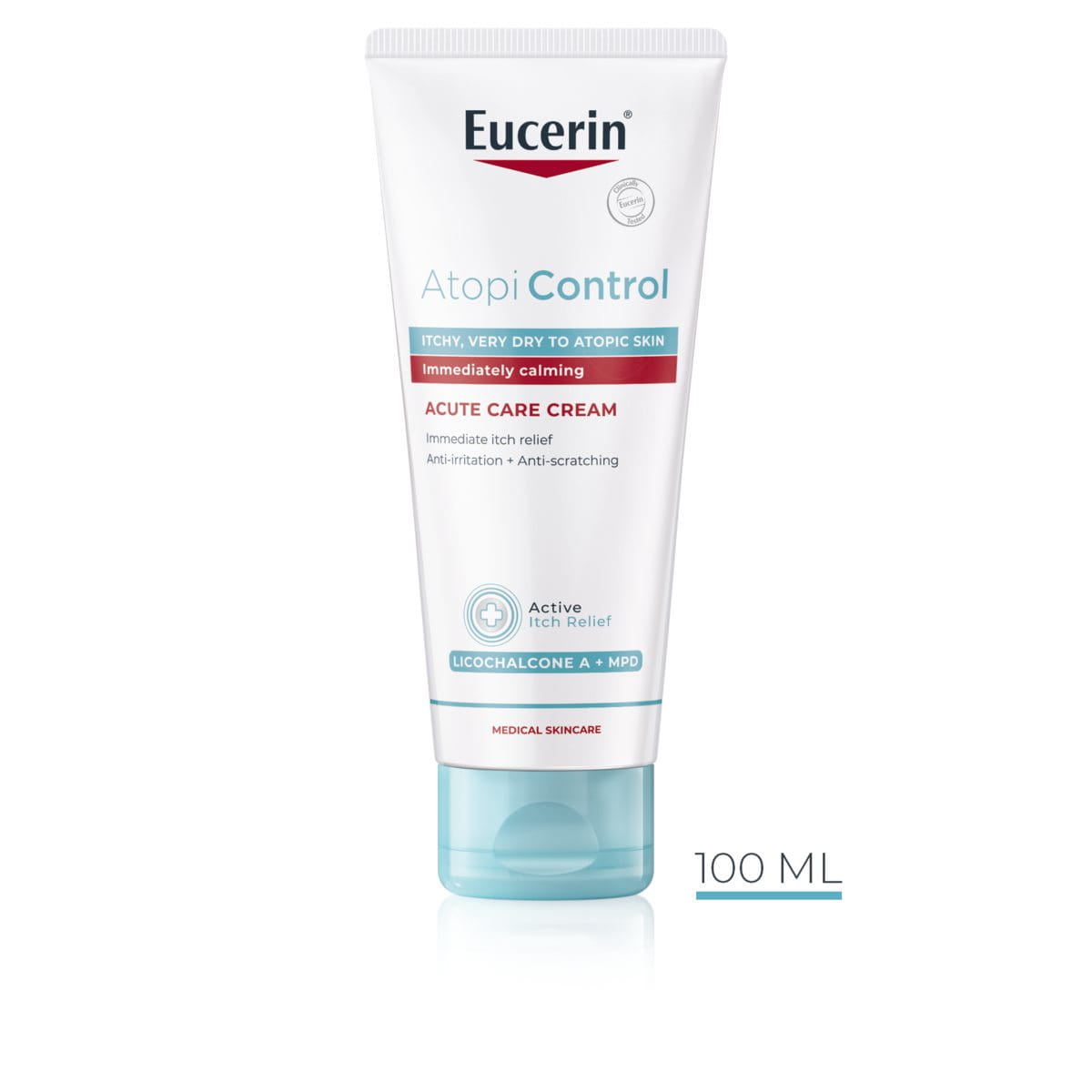 Eucerin AtopiControl akūtas kopšanas krēms nomierina kairinātu ādu un palīdz pārtraukt slimības saasinājumu un niezes radīto apburto loku. Tā kopjošās īpašības palīdz samazināt hidrokortizona lietošanu slimības saasinājuma laikā. Klīniskā pētījumā ir pierādīts, ka AtopiControl akūtas kopšanas krēma ādu kopjošo īpašību kosmētiskā iedarbība uz atopiskas ādas toni ir pielīdzināma 1% hidrokortizona krēma iedarbībai. AtopiControl akūtas kopšanas krēms nav farmaceitisks produkts, un ar to nav paredzēts aizstāt šādus produktus.