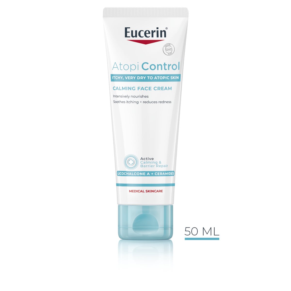 Eucerin AtopiControl sejas krēms satur 12% omega-6 taukskābju, kas nomierina un spēcina sausu, sasprēgājušu ādu, un likohalkonu A, kas novērš iekaisumu un kairinājumu, tāpēc tas mitrina un nomierina ādu, kā arī mazina ādas raupjumu, niezi un savilktas ādas sajūtu. Āda kļūst maigāka un manāmi gludāka. Eucerin AtopiControl sejas krēma saderība ar atopisku ādu un piemērotība bērniem un zīdaiņiem no trīs mēnešu vecuma ir klīniski pierādīta.