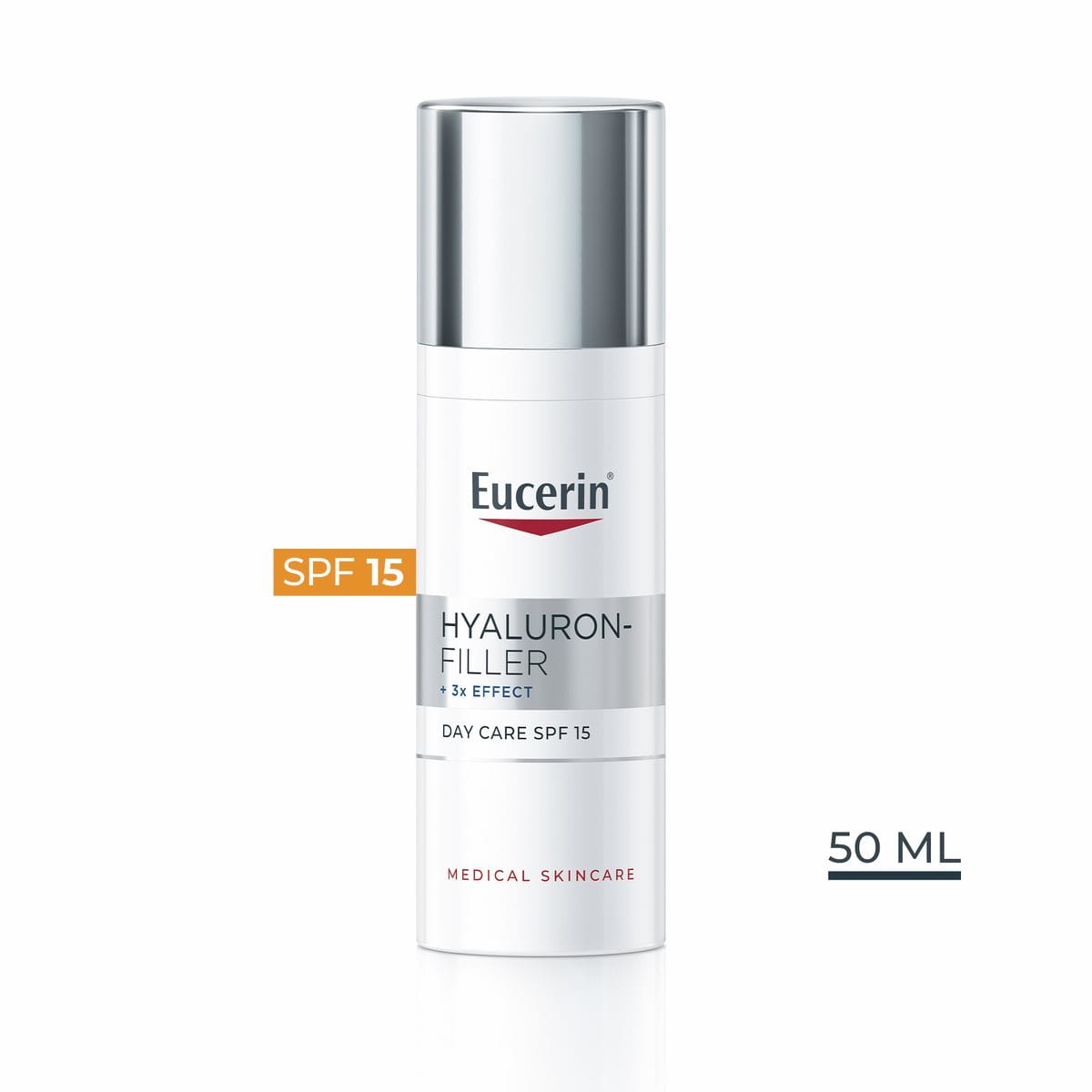 Ādai novecojot, dabiskais hialuronskābes līmenis pazeminās, izraisot mitruma zudumu, veidojot smalkas līnijas un dziļākas grumbas. Eucerin Hyaluron-Filler +3x Effect dienas krēms ar SPF 15 normālai un kombinētai ādai nodrošina intensīvu mitrināšanu un redzamu grumbu aizpildīšanas efektu. Augstas un zemas molekulmasas hialuronskābes kombinācija darbojas mērķtiecīgi – izlīdzina ādas virsmu un vienlaikus iekļūst dziļākajos slāņos, piepildot pat izteiktas grumbas. Pateicoties SPF 15 un UVA filtriem, šī formula palīdz aizkavēt priekšlaicīgu ādas novecošanu saules iedarbības dēļ, vienlaikus ļaujot ādai labāk uzņemt pretnovecošanas krēma aktīvās sastāvdaļas.